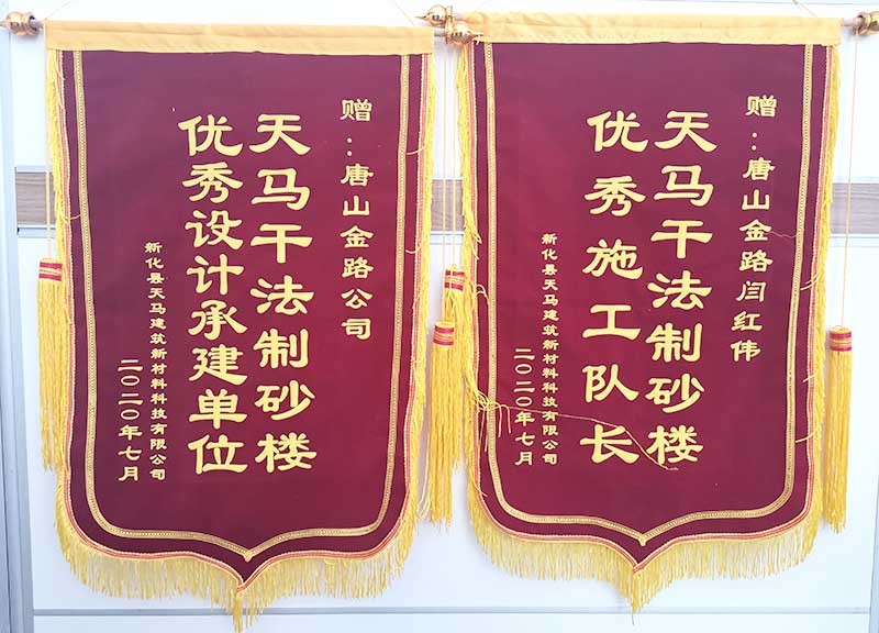 近日,天馬建筑項目負(fù)責(zé)人將兩面印有“天馬干法制砂樓,優(yōu)秀設(shè)計承建單位”、“天馬干法制砂樓,優(yōu)秀施工隊長”的錦旗送到了唐山金路安裝隊長閆紅偉的手上。